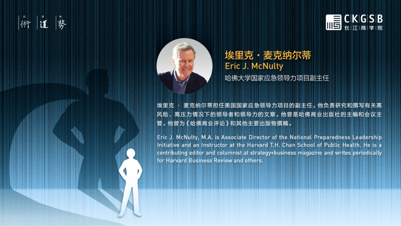 本期长江大讲堂特邀哈佛大学应急领导力倡议项目(NPLI)创始主任伦纳德·马库斯教授(Leonard J. Marcus)、NPLI副主任及哈佛大学陈曾熙公共卫生学院副主任埃里克•麦克纳尔蒂教授(Eric J. McNulty)前来做客,分享哈佛大学经多年实战检验的元领导力模型,并与长江商学院副院长、领导力与激励研究中心主任张晓萌教授进行巅峰对话,探讨企业韧性及打磨领导高效能团队的技能, 让企业和个人在危机四伏的常态中稳健驾驭自身命运。