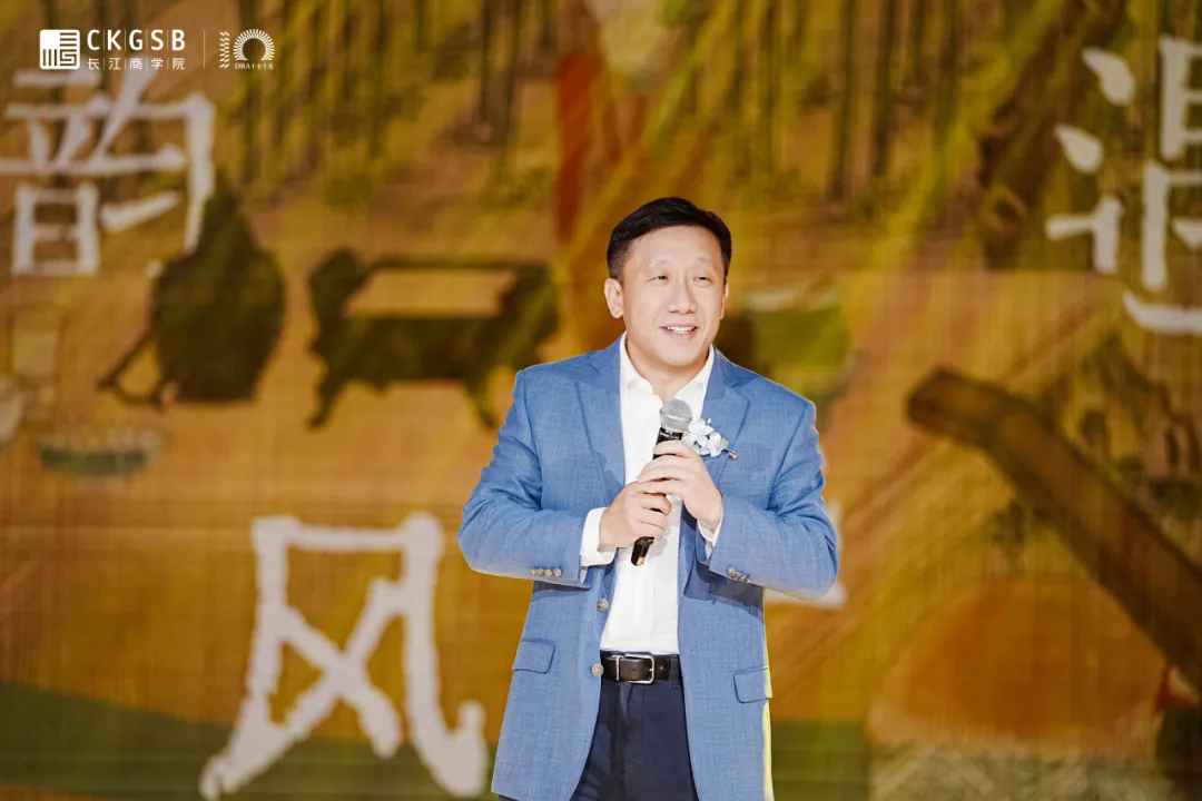 从大厅步入晚宴现场,迎接长江DBA同学们的是一个云雾缭绕的圆形阶梯式舞台,背景大屏上的宋代风格长卷中央写着"宋韵风华,遇见长江"。李海涛院长以长江商学院的"取势、明道、优术"精神寄语学子:"虽然我们正在经历百年未有之大变局,但是只要大家一起努力,所有的挑战也都是机会。"