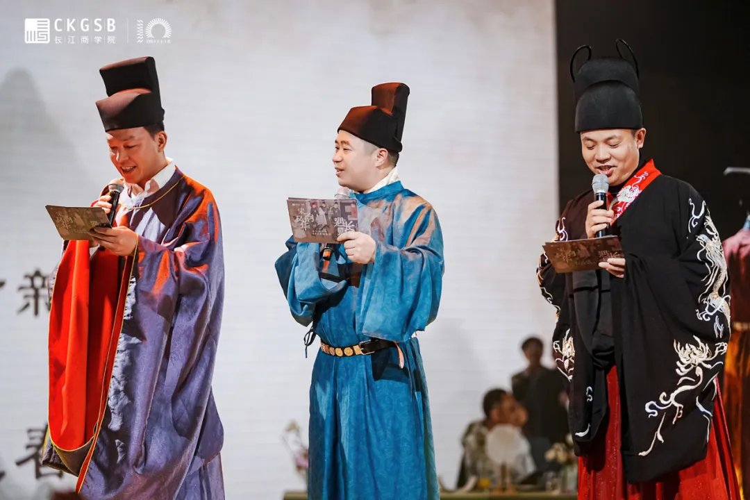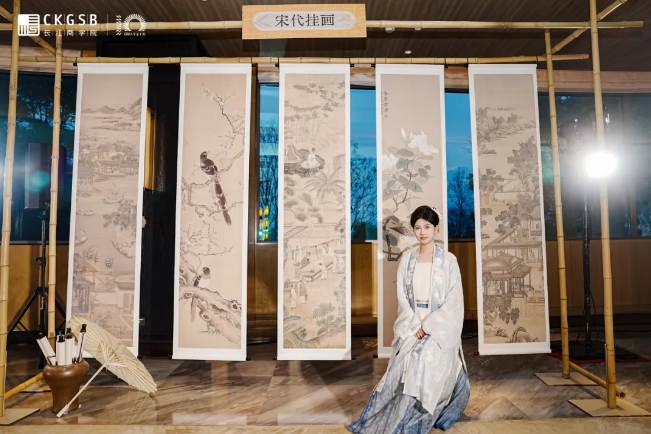 在"又见宋韵"晚宴现场,当DBA跨期同学们换上宋制服饰时,平日里身处商业战场、谈笑风生的企业家们,此时此刻竟都有些"羞涩",穿着古装互相调侃逗趣:"你这造型像极了打虎的武松!""我这是'宋代创业者'版路演打扮!"在一阵阵笑声中,大家卸下身份与包袱,开始沉浸式地体验古人生活。