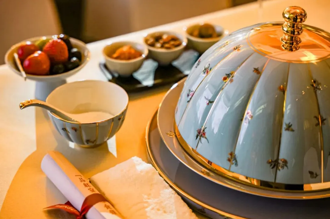 夜色低垂,"品红宴"悄然拉开帷幕,这不仅是一场晚宴,更像一场跨越古今的文化雅集。餐桌上精致的缂丝菜单,复刻了《红楼梦》里的"茄鲞之谜";当厨师用现代分子料理技艺重现这道古味佳肴,米香炸裂声与红酒轻啜声交织出一曲别样的味觉交响。