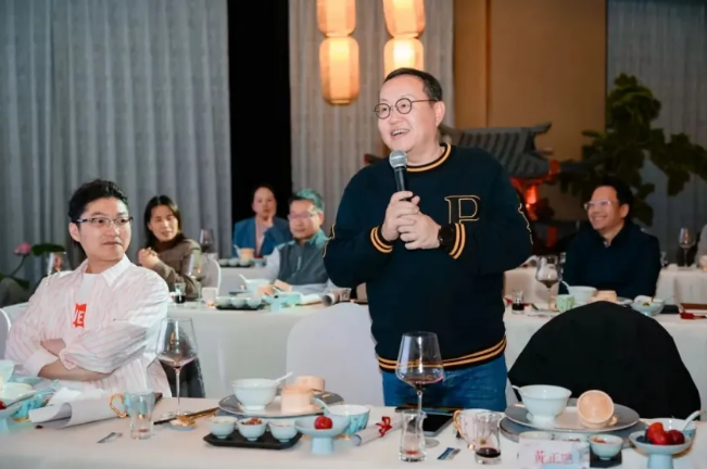 在席间,身为央视《百家讲坛》主讲人的万事利丝绸董事长李建华从《红楼梦》中的菜肴入手,分享了王熙风与杭州的渊源,引发一阵热烈讨论,大家惊喜发现,《红楼梦》中多达六十余处关于丝绸的描写,其实与当代品牌叙事有着奇妙的共通之处。