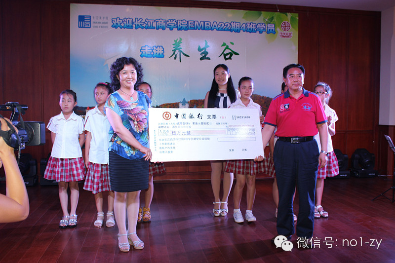 2014年7月12号长江商学院EMBA22期4班学员公益行活动走进吉林通化振国养生谷壹号庄园,学员们在繁忙的工作和学习之余仍然挂念着贫困山区的孩子。刚到庄园,征尘未洗,即刻展开捐助活动,四班师生共计捐公益款5万元,并且组织联系中央文明办、财政部、教育部联合实施的中央专项彩票公益金资助"乡村学校少年宫"项目落户吉林省通化县石湖小学。每所学校先期投入20万元修缮和设备采购资金,主要采购图书、音乐、舞蹈、美术、体育等设施,以后每年支付运转经费5万元,让农村孩子开阔眼界,增长见识,发挥潜能,快乐成长!