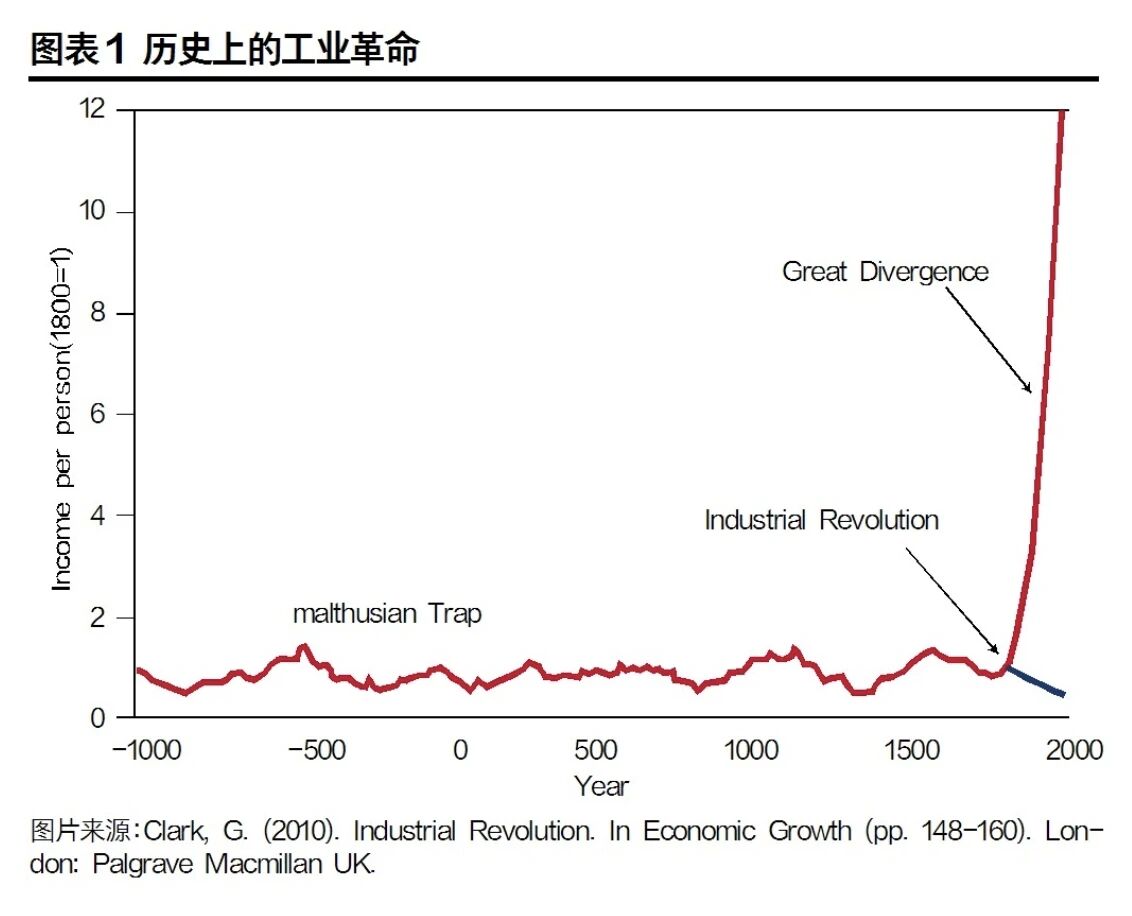 抛开中西之分,从全球来看,在过去几千年里,世界经济曾长期处于“马尔萨斯陷阱”所描述的低人均收入水平状态,这一情况直到第一次工业革命(1800年前后)才迎来转折。