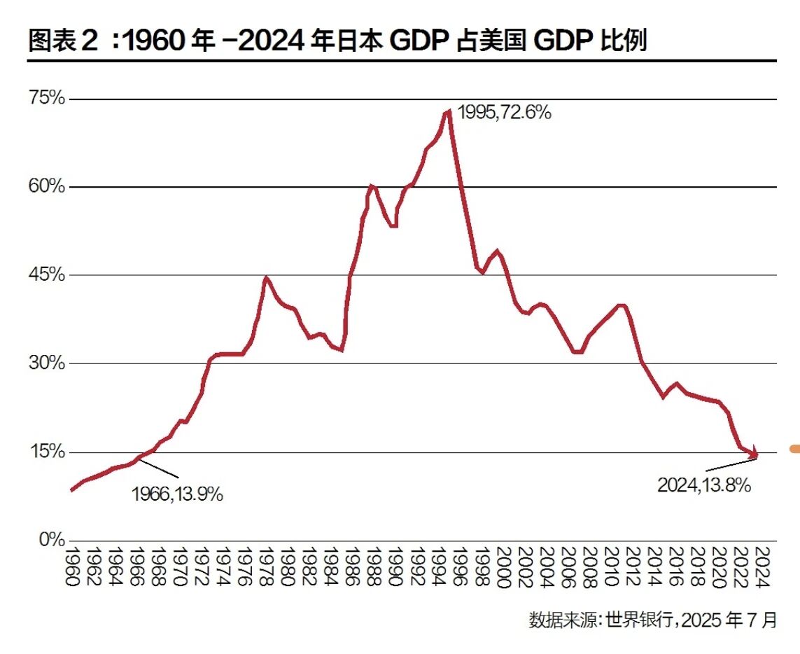 美国知名学者傅高义(EzraF.Vogel)在1979年发表的著作《日本第一:对美国的启示》中,分析和肯定了日本在多方面的成功。但十年之后,日本的经济奇迹消逝,进入了长久的衰退和停滞不前。2024年日本的GDP只有美国的13.8%。