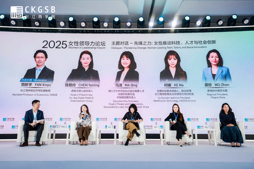 主题对话环节,在长江商学院经济学助理教授范昕宇的主持下,四位来自不同领域的杰出女性围绕“女性推动科技、人才与社会创新”这一主题,分享了各自企业的经验。
