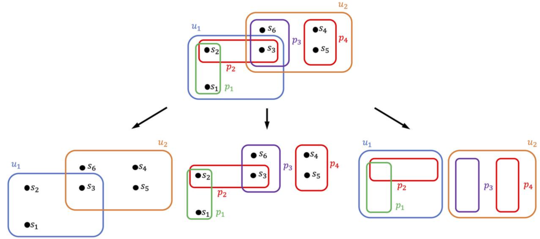 这三张超图通过共享的实体(用户、产品和类别)相互连接,形成一个完整的网络结构。在这个空间里,彼此接近的实体更可能通过“超边”相连,意味着它们反映类似的偏好或使用体验。以下图为例,网络中包含两个用户(u1、u2)、四个收藏类别(p1–p4)和六个产品(s1–s6)。因此,前面提到的三个超图通过互锁的方式便可以简洁而完备地为这个网络结构建模。